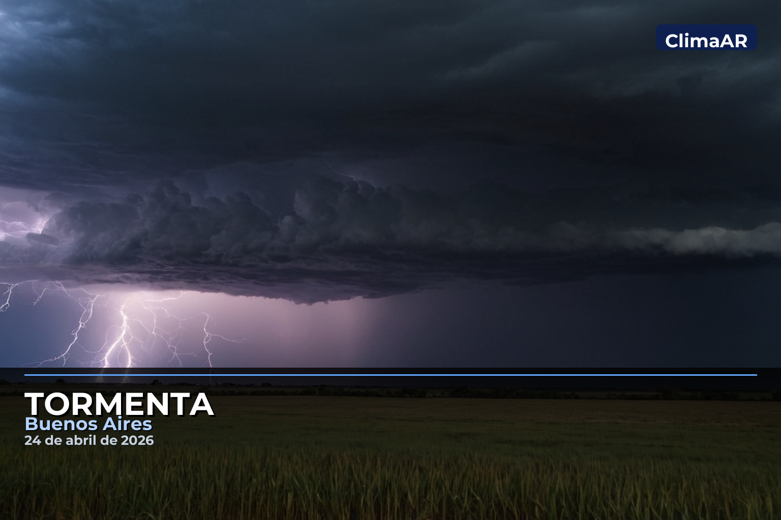 Este viernes, una tormenta afecta a la provincia de Buenos Aires. La tormenta se combina con lluvias intensas, con una temperatura mínima de 9,9°C y una máxima de 23,7°C, mientras que el viento sopla a 22 km/h. El Servicio Meteorológico Nacional (SMN) monitorea la situación.